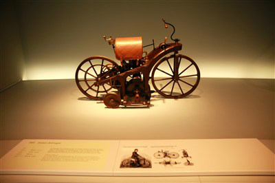 1883年,戴姆勒研制出了一台小型的高速煤油、汽油两用发动机。1885年,他又将这台内燃机安装在一辆橡木车架、前轮直径为86.4厘米,后轮直径为86.6厘米的自行车上,并将这辆二轮车命名为“戴姆勒单轨道号”。这辆摩托车是用四冲程内燃梵作动力,采用的是单缸、风冷、排量为264毫升、转速为每分钟700转、功率为0.37千瓦的汽油机,并装有两档变速器,时速可达12千米。车为木质结构,后轮为皮带传动,两侧有辅助支撑轮,这是现代摩托车的雏形。