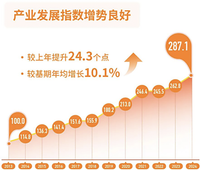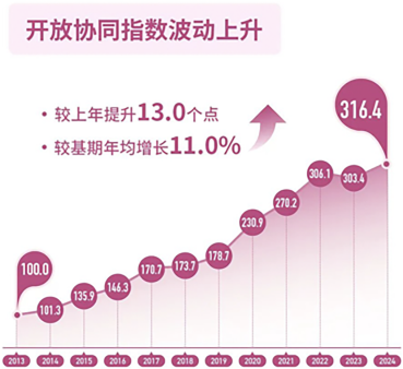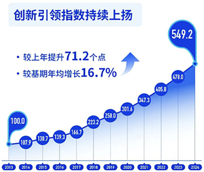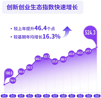 “中关村指数2025”结果显示,综合指数持续攀升,2024年达362.1,较上年提升32.7个点,相比基期年均增长12.4%,体现出中关村持续创新发展的良好态势。五个分项指数中,创新引领指数和创新创业生态指数均首次突破500,分别达到549.2、524.3,相比基期分别年均增长16.7%、16.3%,是推动综合指数持续增长的重要动能;产业发展指数延续向好趋势,达到287.1,相比基期年均增长10.1%;开放协同指数波动上升,达到316.4,相比基期年均增长11.0%;宜居宜业指数平稳提升,达到133.4,相比基期年均增长2.7%。