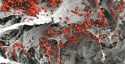 这是工程化3D骨髓组织的电子显微镜图像,图中红色部分为定植的人体血细胞。