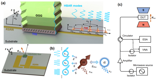 (a)磁力薄膜微腔与微波谐振腔之间的耦合示意图,(b)微波—磁振子—机械声子之间相互作用示意图,(c)实验测试系统示意图