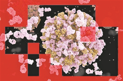 抗体(粉红色)与流感病毒(棕色)结合示意图。