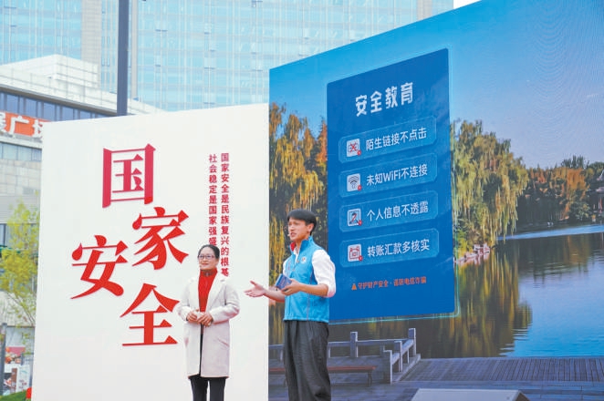 海淀区昨天举办全民国家安全教育日活动,志愿者通过情景剧演绎向市民普及国家安全知识。 本报记者 王海欣摄