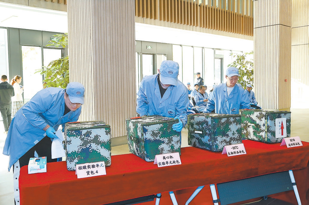 11月4日,在位于北京的中国科学院空间应用工程与技术中心,工作人员检查返回实验样品转运包状态。新华社发