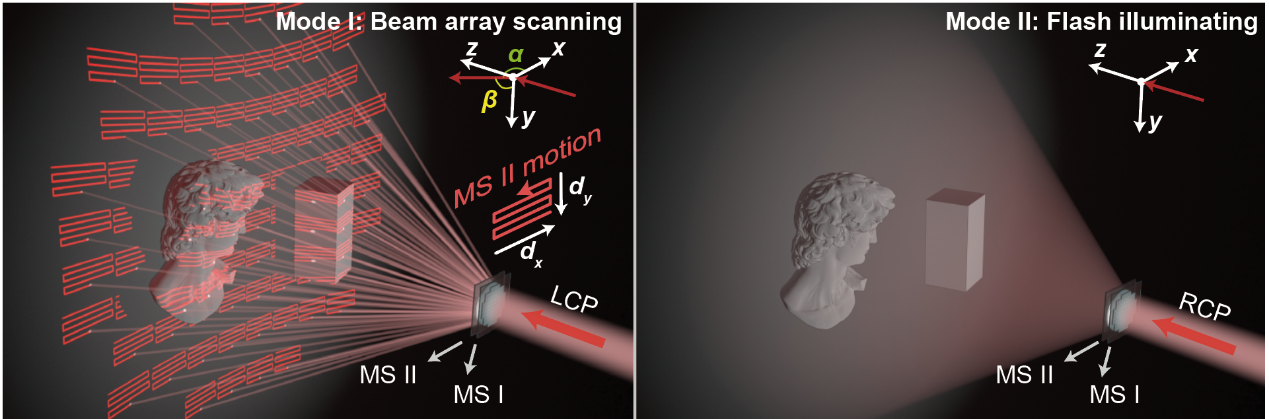 该方案核心在于一种名为“混合级联平动超表面”的器件,由两层经过特殊设计的纳米镜片组成。通过改变入射激光的偏振态,系统可以在高精度扫描模式和闪光模式之间自由切换。在扫描模式下,系统能精确捕捉远处目标的细节;在闪光模式下,则能一次性均匀照亮整个视野,瞬间完成三维成像。