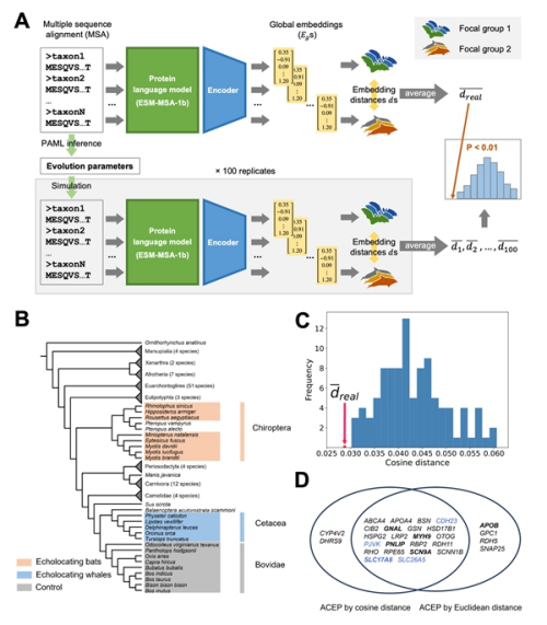 基于此,团队开发ACEP分析流程:首先计算同源蛋白嵌入向量的真实距离,再通过模拟中性进化构建背景分布,最后进行统计检验以识别显著的高阶趋同信号。该方法在多个已知趋同案例中成功检出信号。全基因组筛选发现,蝙蝠与齿鲸之间有数百个基因呈现此类信号,显著富集于“感官感知”等功能,包括已知回声定位基因及新候选基因,部分还通过正选择检验。研究进一步解析了嵌入向量趋同背后的理化特征,提升了可解释性。