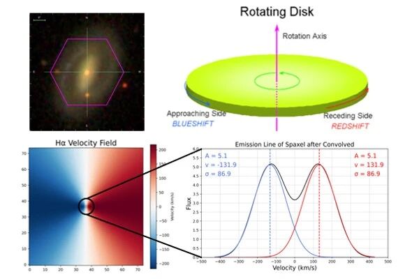 此次,研究团队聚焦棒旋星系,提出并验证了“旋转盘+核环”模型是产生对称双峰窄发射线的新机制。在棒旋星系中,星系棒结构驱动气体向内流动,在内林德布拉德共振区域聚集形成明亮的核环。该核环尺度小但位于星系旋转曲线变化最陡的区域,两侧气体具有显著的速度差异:一侧高速朝向观测者(蓝移),另一侧高速远离(红移)。由于望远镜的空间分辨率限制(点扩散函数效应),中心观测像素混合了这两侧气体的光谱贡献,从而形成对称的双峰轮廓。