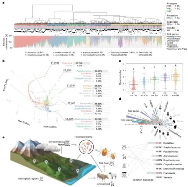 研究通过深度基因组分析,获得7783个中等质量以上的宏基因组组装基因组(MAGs),并筛选出1373个代表性基因组,其中约三分之二为未定义物种,凸显蜱微生物组的复杂性。分析发现,蜱的微生物组成具有显著的蜱种和地域特异性。研究识别出5种由不同细菌主导的微生物组生态型,其分布受温度、湿度等环境因素显著影响,且不同生态型受相似环境驱动。