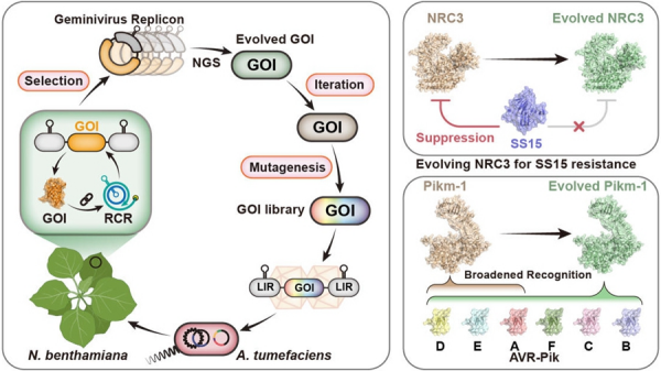研究人员利用该系统成功实现了植物免疫受体NRC3和Pikm-1的体内定向进化,验证了其在提升植物抗病能力方面的强大潜力。GRAPE系统突破了传统体外进化需复杂转化和功能验证的局限,实现了“进化—筛选—应用”的一体化流程。