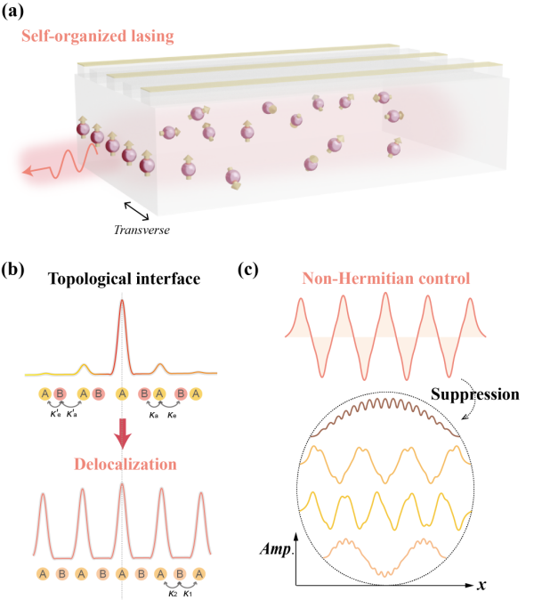 传统半导体激光器受限于多模混沌同步,往往在提升功率时牺牲光束质量,或为保证稳定性而降低输出。研究团队创新性地结合拓扑光子学与自组织原理,利用一维Su-Schrieffer-Heeger(SSH)模型的结构对称性,调控晶格耦合强度,实现拓扑边界态在空间上的离域化分布,扩大能量承载范围,从而提升输出功率。同时,通过图形化电极结构引入非厄米调制,使离域化边界态在无序环境中仍能主导激光模式,触发自组织同步,显著增强光场的时空相干性。