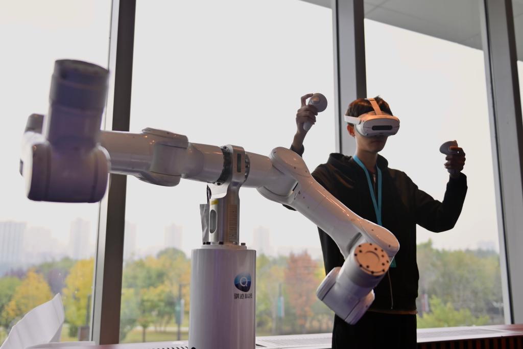 10月17日,在广东天机智能系统有限公司展台,工作人员演示“全力控高精度人形臂Marvin”展品。新华社记者 吴青昊 摄