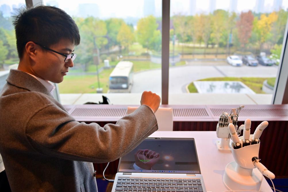 10月17日,在中国科学院沈阳自动化研究所展台,工作人员演示“仿生五指灵巧手”展品。新华社记者 吴青昊 摄