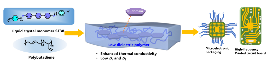 针对传统聚合物导热差、信号损耗高等问题,中国科学院上海有机化学研究所研究员房强和孙晶团队利用液晶有序效应,成功开发了一种高性能低介电液晶聚合物。研究团队设计合成了含三联苯、长烷基链及苯乙烯端基的液晶分子ST38,并将其交联于聚丁二烯(PB)中,形成ST38PB液晶聚合物。在高温处理下,ST38自组装为有序层状液晶畴,其排列通过苯乙烯交联反应被“锁定”,即使在260℃仍保持结构稳定。该材料展现出显著提升的导热性能:面内导热系数达0.62W·m⁻¹·K⁻¹,是原始PB(0.18 W·m⁻¹·K⁻¹)的3.4倍;同时在10GHz高频下,Dk仅为2.40,Df低至3.3×10⁻³,介电性能优异。此外,ST38PB薄膜还具备良好柔韧性、热稳定性和疏水性。这些特性使其在微电子封装、高频高速印制电路板(PCB)等领域具有广阔应用前景。