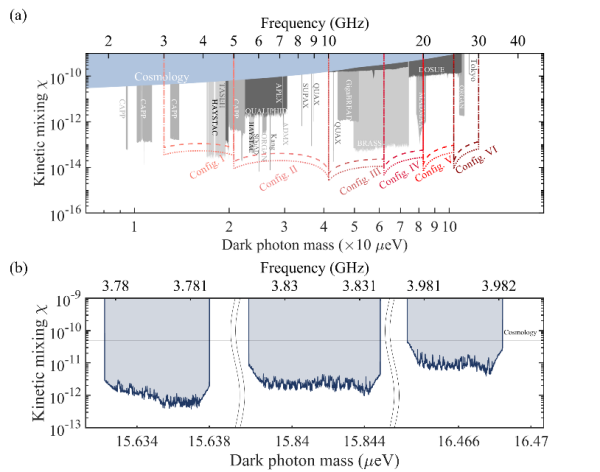 现代宇宙学观测表明,暗物质约占宇宙总质量的25%,其中轴子和暗光子等超轻玻色子(质量约1–100 μeV)因与普通物质相互作用极弱,成为重要候选者。然而,现有探测手段常受限于测量范围与灵敏度难以兼顾。针对这一挑战,该团队利用微纳加工技术,在单芯片上集成多个频率可调的超导量子比特,构建出可同步扫描多个能区的高灵敏探测平台。研究团队研制了三比特超导量子芯片,同时对15.632–15.638、15.838–15.845及16.463–16.468 μeV三个暗光子能区开展搜寻,并给出了当前最严格的暗光子-光子耦合强度上限,较此前基于天文观测的限制提升1至2个数量级。该方案通过并行探测显著拓展了有效搜索带宽,同时保持量子传感的高灵敏度,突破了传统方法的瓶颈。