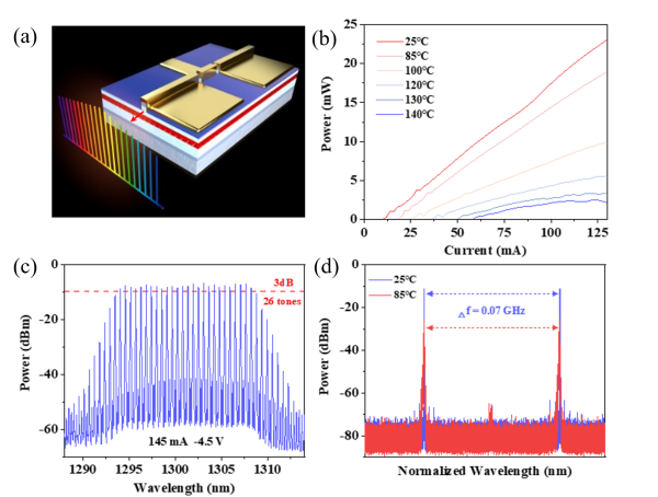 中国科学院半导体研究所陈思铭团队联合合作者成功研制出一款可在140°C极端高温下稳定工作的100GHz量子点光频梳激光器,为下一代高速、低功耗光互连提供了关键光源。