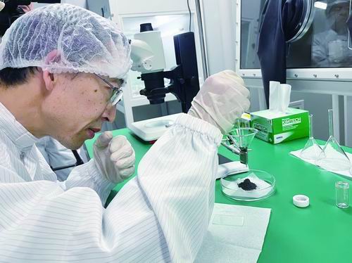 ▲祁生文对嫦娥六号月壤样品开展固定漏斗实验。