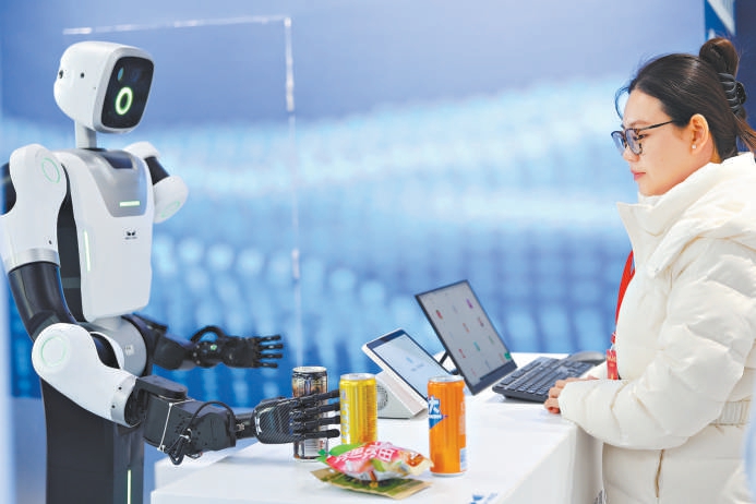 2月2日,“瓣瓣同心京津冀”集中采访来到雄安人工智能产业园。图为机器人售货员为体验者拿取商品。 实习记者 常一鸣摄