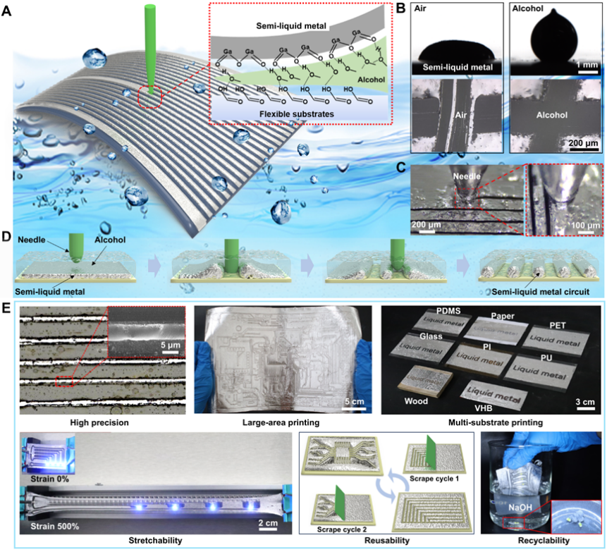 在柔性电子制造领域,传统工艺往往面临材料损耗大、环境污染高、与复杂曲面贴合难等瓶颈。近期,中国科学院理化技术研究所等团队在半液态金属柔性电子制造方面取得系列进展,为高性能、绿色化、规模化应用提供了创新技术方案。