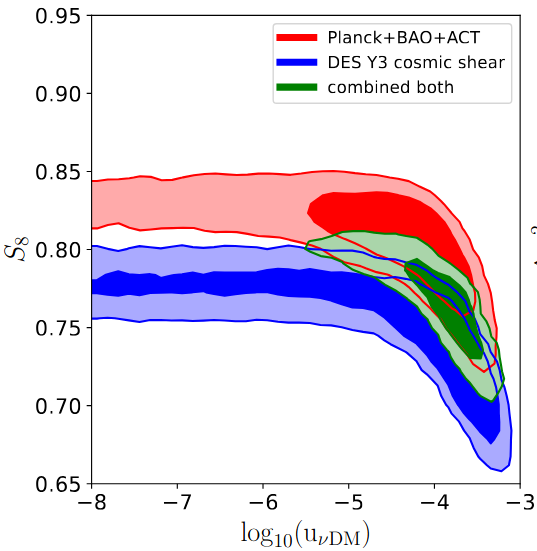 宇宙学中存在“S8冲突”难题,即早期宇宙观测推算的物质聚集程度,高于晚期宇宙直接观测结果。研究团队提出假设:若暗物质与中微子发生微弱非引力相互作用,或可抑制小尺度结构形成、解决该难题。团队通过分析早期阿塔卡马宇宙学望远镜数据和晚期暗能量巡天弱引力透镜数据,发现两者均显示暗物质—中微子相互作用强度趋向“非零”;联合分析后,该相互作用统计显著性达约3σ,强度约为10⁻⁴,可使早期与晚期宇宙S8参数趋于一致。