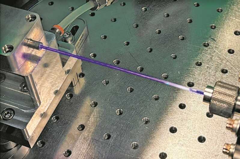 为此,团队采用红光和蓝光激光,通过“反共振空心光纤”让光束与氙气原子碰撞,将可见光转化为真空紫外光。该光纤类似光纤电缆,但由一个中空管道和七个小管组成。