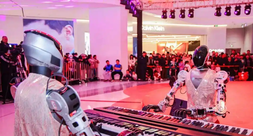 走进一层中庭,开幕舞台前人头攒动,喝彩声此起彼伏。舞台上,一群小朋友正和机器人一起跳英歌舞,动作整齐划一。这台机器人正是今年央视春晚同款的松延动力小顽童N2。和蔡明演过小品的它,此刻正带着孩子们跳得欢快。“你看它还会抱拳拜年呢。”一位大爷举着手机对老伴说。