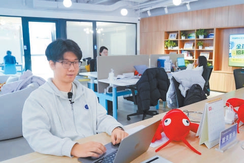 国纪龙在中关村AI北纬社区工位上工作。本报记者 王海欣摄