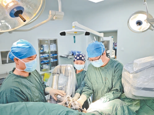 11月8日,骨科团队为王奶奶实施手术。机器人的智能系统如同“三维活体CT”般实时运行。在机器人亚毫米级定位系统辅助下,导向器帮手术团队精准掌握定位手术器械与植入物位置。伴着手术设备清亮的沙沙声,加压螺钉稳定到达股骨头预定位置。