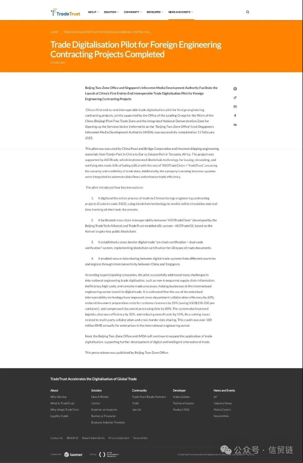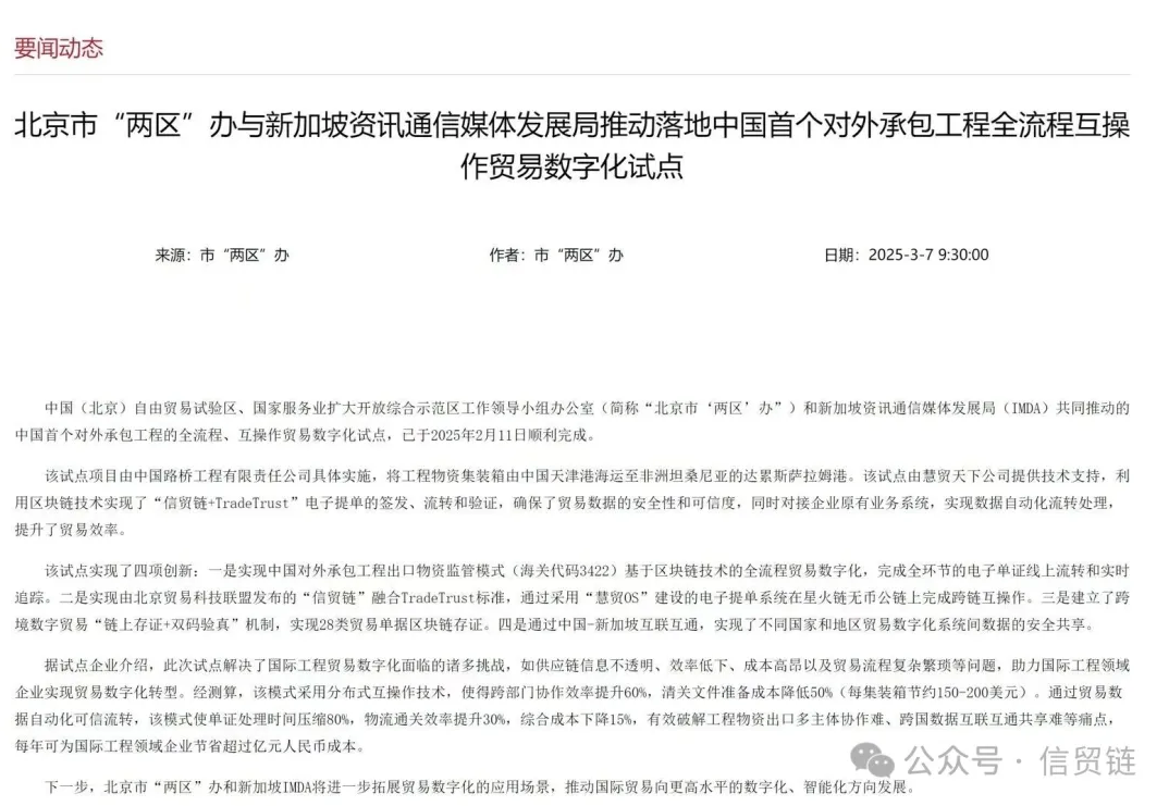 中国(北京)自由贸易试验区、国家服务业扩大开放综合示范区工作领导小组办公室(简称“北京市‘两区’办”)和新加坡资讯通信媒体发展局(IMDA)共同推动的中国首个对外承包工程的全流程、互操作贸易数字化试点,已于2025年2月11日顺利完成。