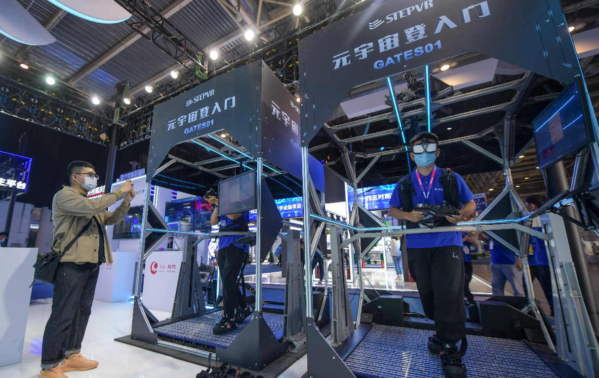 穿上VR背包,戴上VR眼镜,站在万象跑步机上,手持手柄,就可以进入游戏场景,犹如真人在游戏中畅玩。这是朝阳展区的元宇宙登入门,吸引观众争相体验。“欢迎来到元宇宙登入门!” 现场工作人员说,“除了体验游戏,未来这个元宇宙登入门还将在运动健身等领域应用,让人们身临其境。”