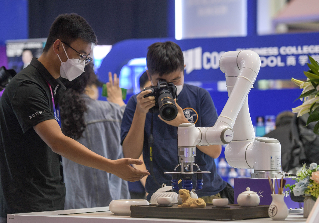 同样吸引眼球的还有HICOOL商学院展区的软体机器人。伴随机械臂转动,前端柔软的夹爪可以精准地抓取茶杯,并将茶水倒入指定的杯子里。