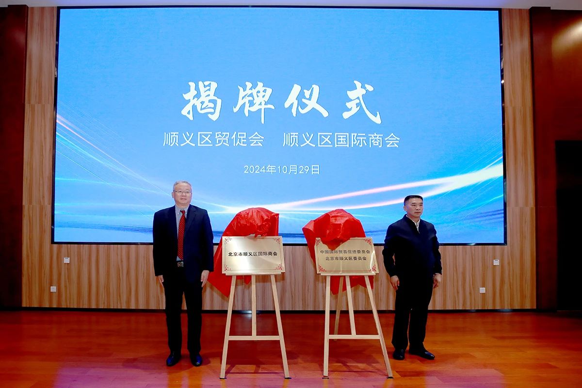 揭牌仪式上,市贸促会副主任、北京国际商会副会长兼秘书长朱家亮和顺义区副区长(兼)、首都机场临空经济区工委副书记、管委会副主任宋鹏为顺义区贸促会、顺义区国际商会揭牌。