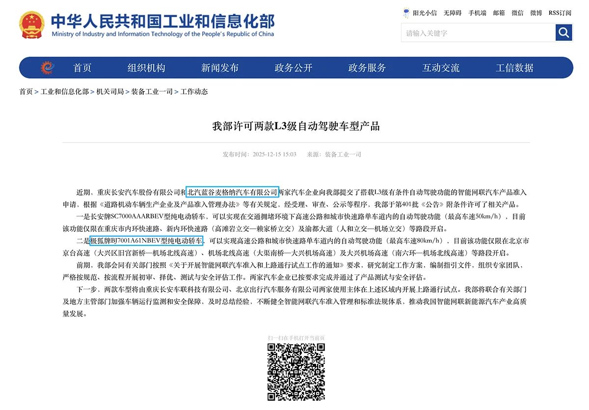 12月15日,中华人民共和国工业和信息化部公布2款车型获得我国首批L3级有条件自动驾驶车型准入许可,北汽集团旗下极狐阿尔法S(L3版)就是其中之一。这标志着我国自动驾驶技术发展逐步走向量产应用阶段,也是北汽集团在自动驾驶领域从技术验证阶段迈向量产应用阶段的重要里程碑。