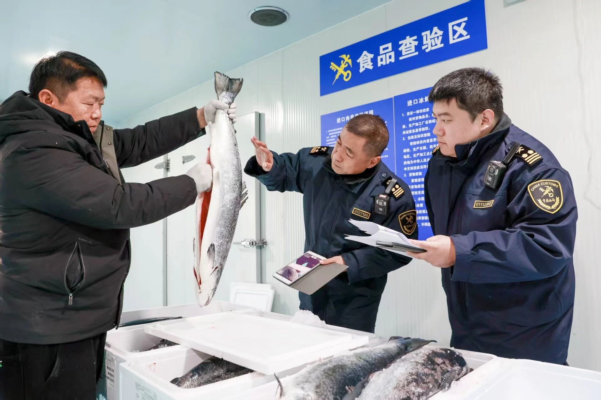 工作人员对进口挪威大西洋鲑鱼进行查验。