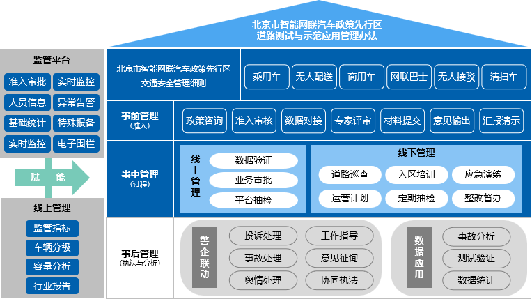 二是加速推进政策法规标准化进程,打造友好测试监管环境。在政策体系方面,聚焦全无人、高速公路、无人接驳等场景,累计出台10项行业代表性管理政策。在推进立法方面,组织区内代表企业召开多次企业调研,充分了解企业立法诉求。目前《北京市智能网联汽车管理条例》已纳入2023年度市人大立法工作计划。在标准化成果方面,搭建“车-路-云-网-图-安全”示范区标准体系,累计完成示范区标准20项。推动5项团体标准转化与6项北京市地方标准研制。与此同时,持续建设完善“事前—事中—事后”监管体系,采取强化管理、优化服务并重措施,为企业车辆测试及商业化探索提供保障。截至今年3月,示范区内测试企业达19家,入网车辆数量达578辆,累计自动驾驶里程达到1449万公里。