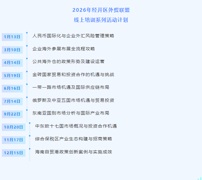 线上培训赋能:2026年经开区外贸联盟专属培训即将开启,覆盖人民币国际化、海外参展攻略、公共海外仓运营、金砖国家合作、一带一路市场布局等核心主题,帮您提前掌握出海必备技能。