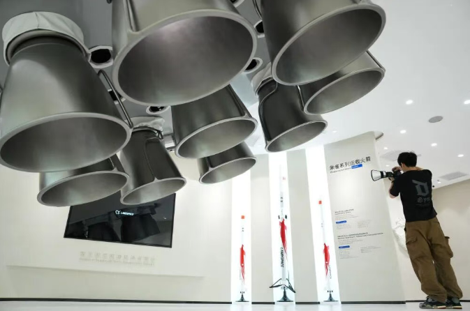 强化产业圈联动发展,是北京持续提升科技成果区域内转化效率和比重的有效举措。以商业航天产业为例,目前,扎根北京的商业航天百强企业、上市企业和独角兽企业约占全国半壁江山。产业链覆盖运载火箭、卫星制造、地面站及终端设备、卫星应用服务全领域。这是2025年6月18日在北京经济技术开发区蓝箭航天空间科技股份有限公司拍摄的朱雀系列运载火箭模型。