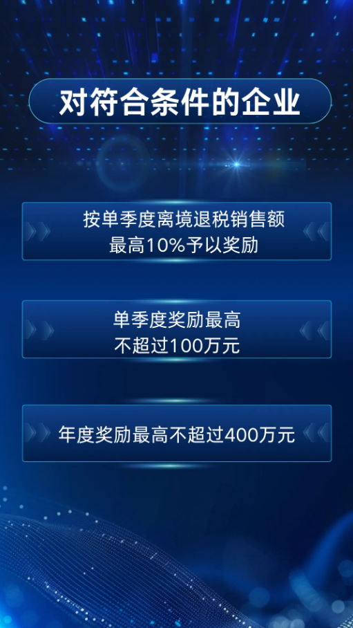 支持企业丰富退税商品、优化退税服务,积极扩大离境退税销售额,促进入境消费。对符合条件的企业,按单季度离境退税销售额最高10%予以奖励(其中,普通离境退税申请单按对应销售额的最高8%予以奖励;“即买即退”申请单按对应销售额的最高10%予以奖励),单季度奖励最高不超过100万元,年度奖励最高不超过400万元。