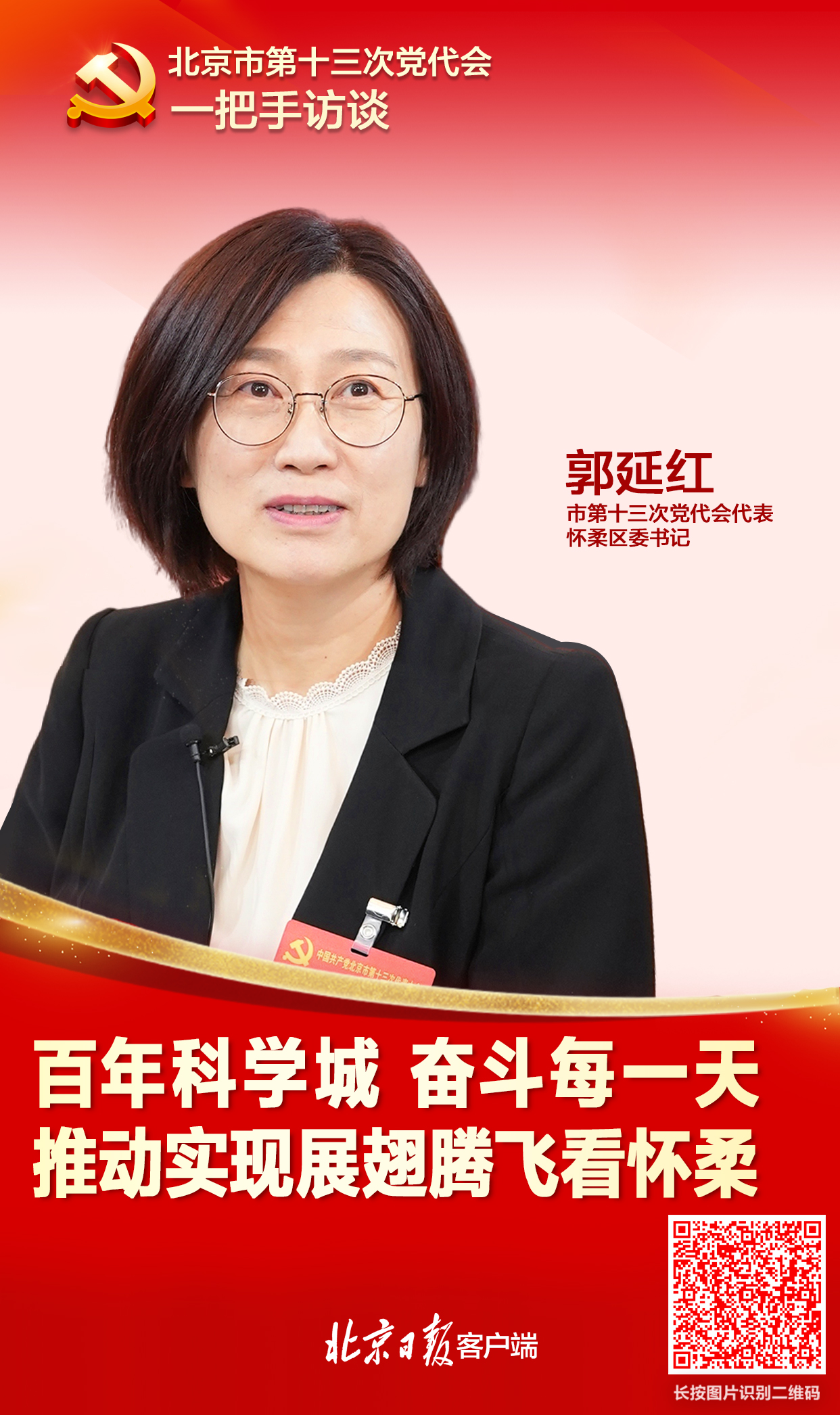 在中国共产党北京市第十三次代表大会上,党代表、怀柔区委书记郭延红来到北京日报客户端“一把手访谈”演播室。郭延红表示,坚持以新时代首都发展为统领,加紧突破怀柔综合性国家科学中心,高水平建设国家实验室,扎实推进雁栖湖国际会都扩容提升。