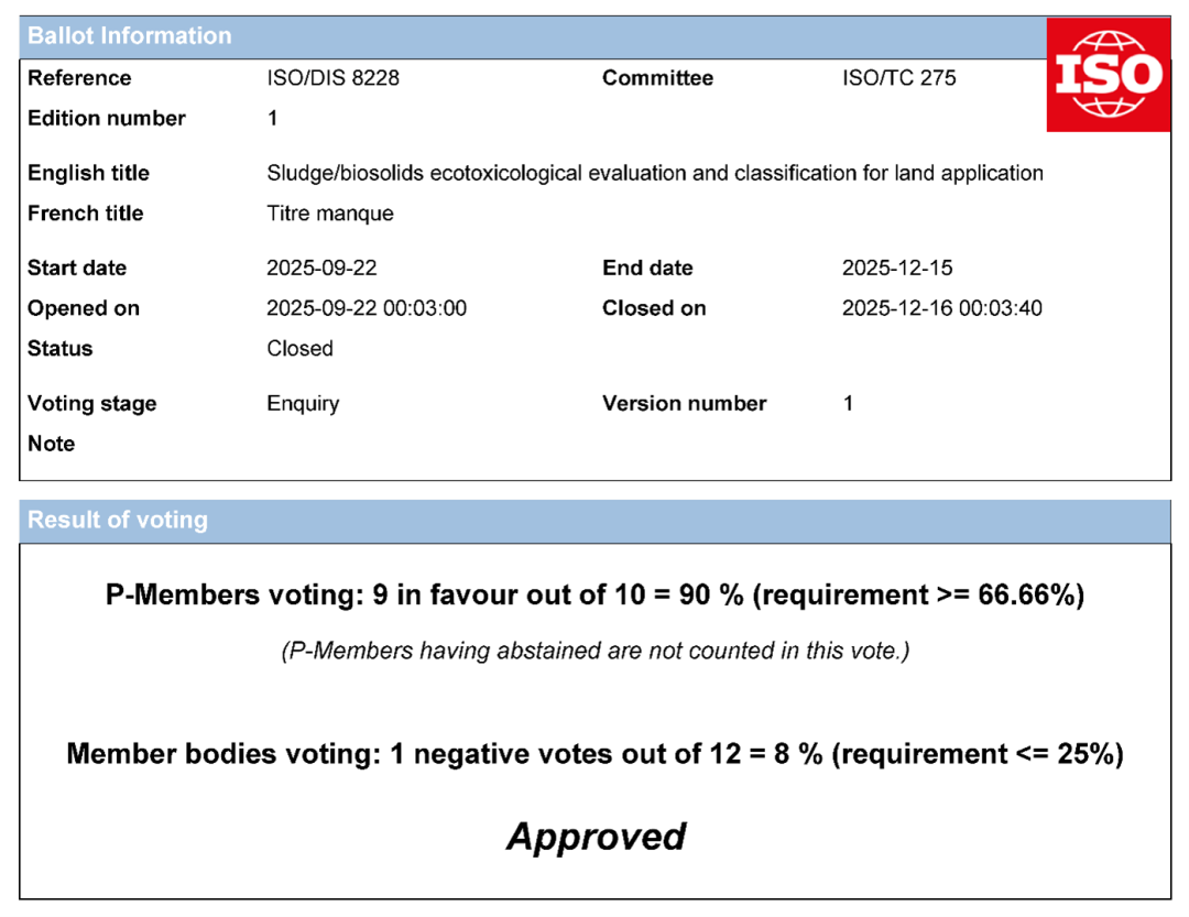 近日,国际标准化组织(ISO)正式公布ISO/DIS 8228《污泥土地利用风险评估及分级标准》(Sludge/biosolids ecotoxicological evaluation and classification for land application)制定的最终投票结果。根据ISO技术委员会的统计数据,该标准送审案在参与投票的成员国中获得90%的高票通过,远超国际标准化组织规定的66.66%通过线,充分展示国际上对中国提出的污泥安全资源化系统解决方案与标准的高度肯定。