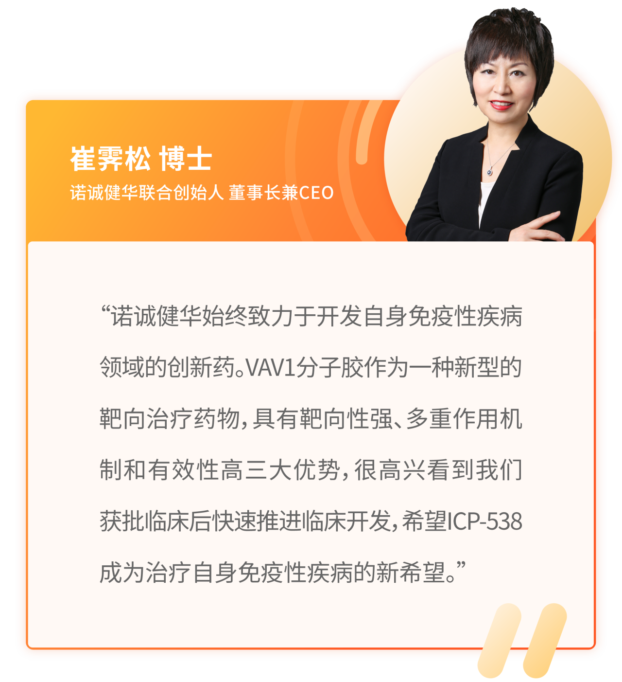 ICP-538是诺诚健华自主研发的新型口服高效、高选择性靶向VAV1的特异性分子胶降解剂,VAV1是T细胞和B细胞受体下游的关键蛋白。ICP-538通过选择性介导CRBN E3泛素连接酶与VAV1蛋白形成三元复合物,剂量依赖性地诱导VAV1蛋白快速高效降解,用于开发治疗多种难治的自身免疫性疾病,比如炎症性肠病(IBD)、系统性红斑狼疮(SLE)和多发性硬化(MS)。目前,全球尚无获批上市的VAV1靶向药物。