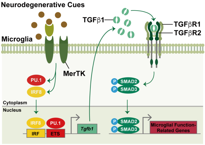 本次研究基于前期研究成果(Protein Cell 2019),研究团队进一步解析了小胶质细胞响应神经退行性疾病的分子机制。研究首先发现,在小鼠创伤性视神经损伤模型中,小胶质细胞的激活依赖于吞噬受体MerTK。其中,MerTK触发的下游磷脂酶C信号足以诱导调控小胶质细胞功能的关键转录因子PU.1和IRF8表达上调。进一步的染色质免疫共沉淀测序分析表明,PU.1和IRF8直接靶向TGFβ1基因位点,而破坏该靶位点可抑制神经退行性疾病过程中小胶质细胞TGFβ1表达。