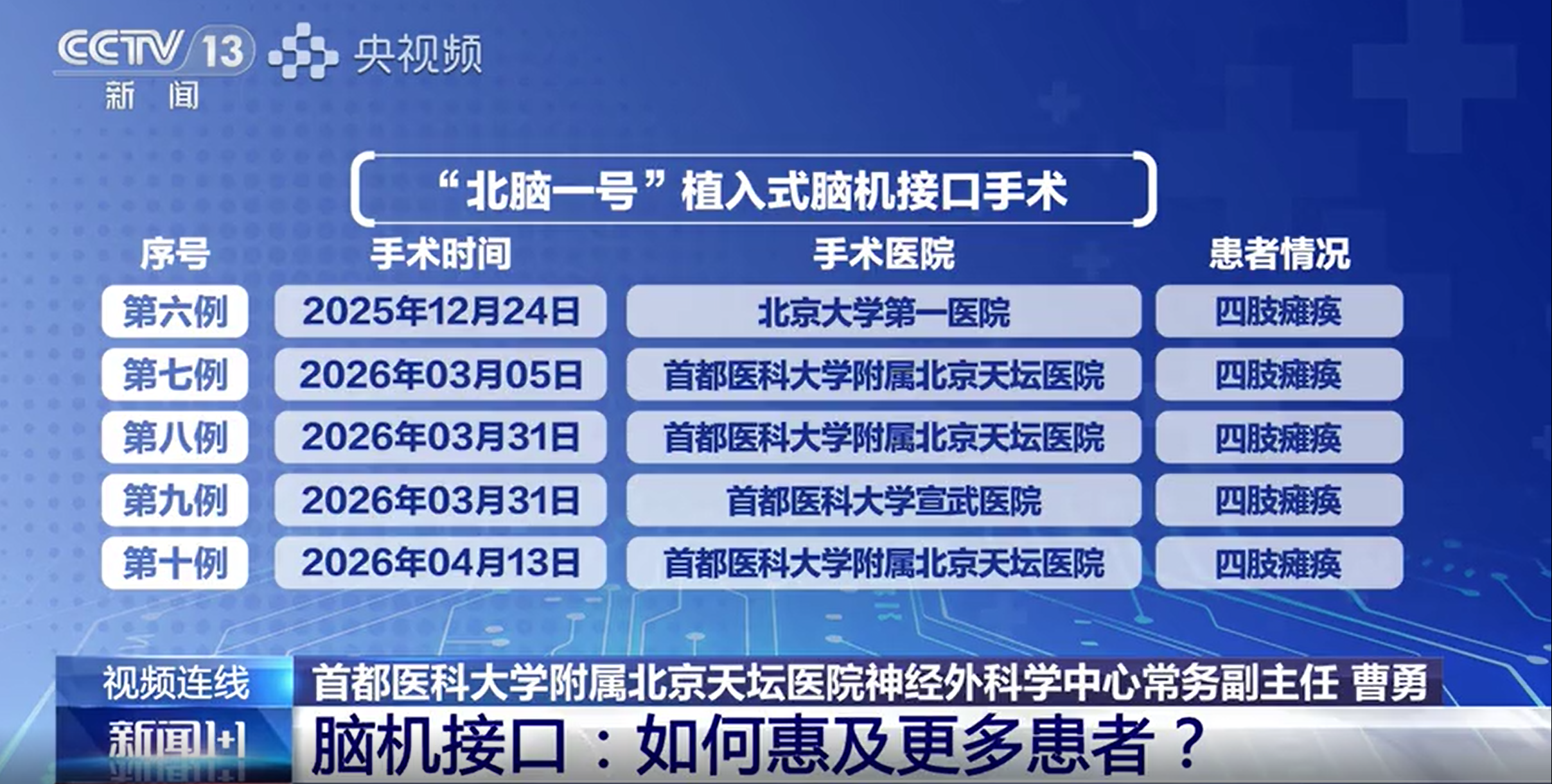 “北脑一号”植入式脑机接口手术已完成10例,涉及四肢瘫痪、渐冻症等疾病
