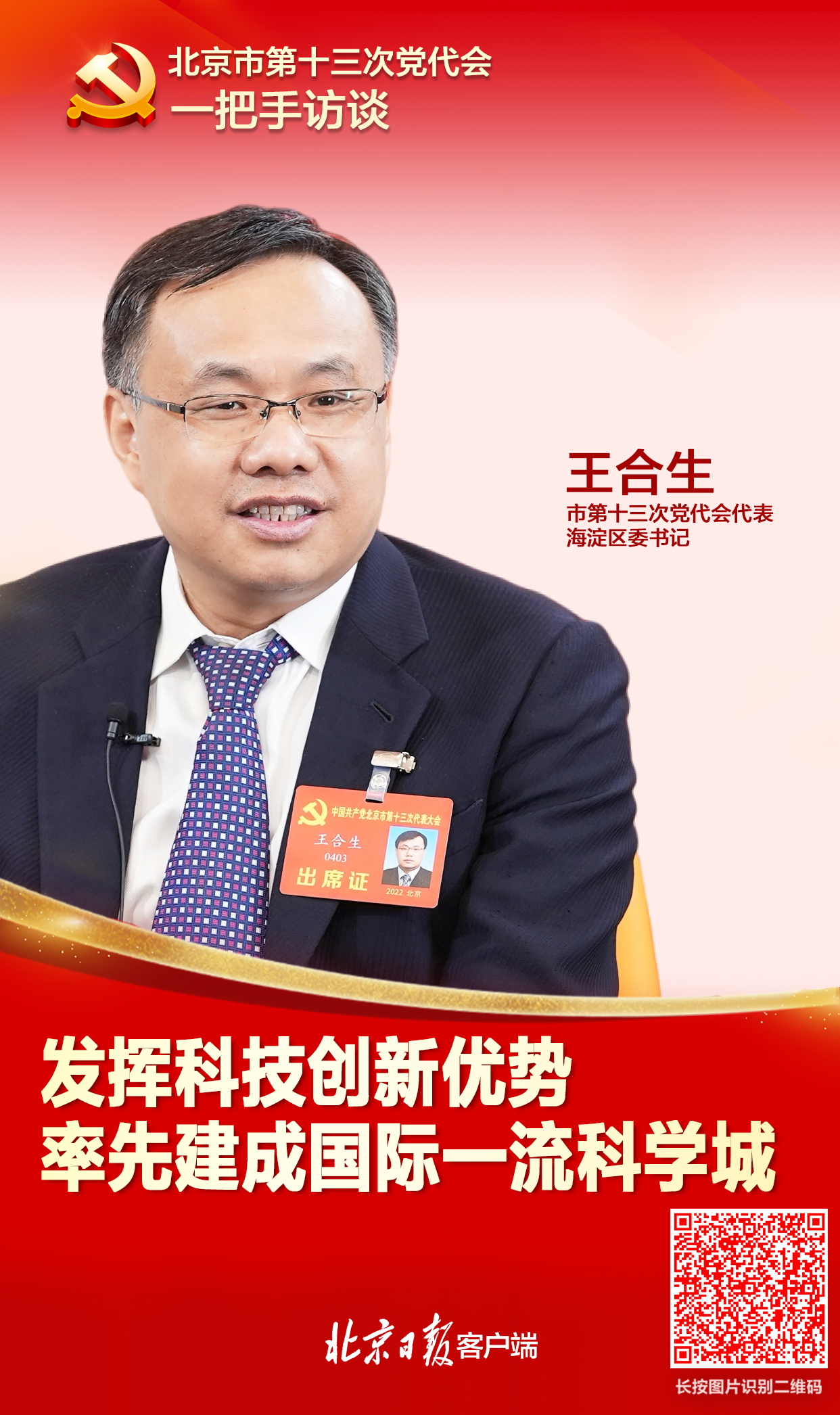 在中国共产党北京市第十三次代表大会上,党代表、海淀区委书记王合生来到北京日报客户端“一把手访谈”演播室。王合生表示,未来五年,海淀区将紧紧围绕“率先建成国际一流的科学城”,充分发挥海淀经济强区、科教强区、人才强区优势,更加奋发有为推动首都高质量发展。