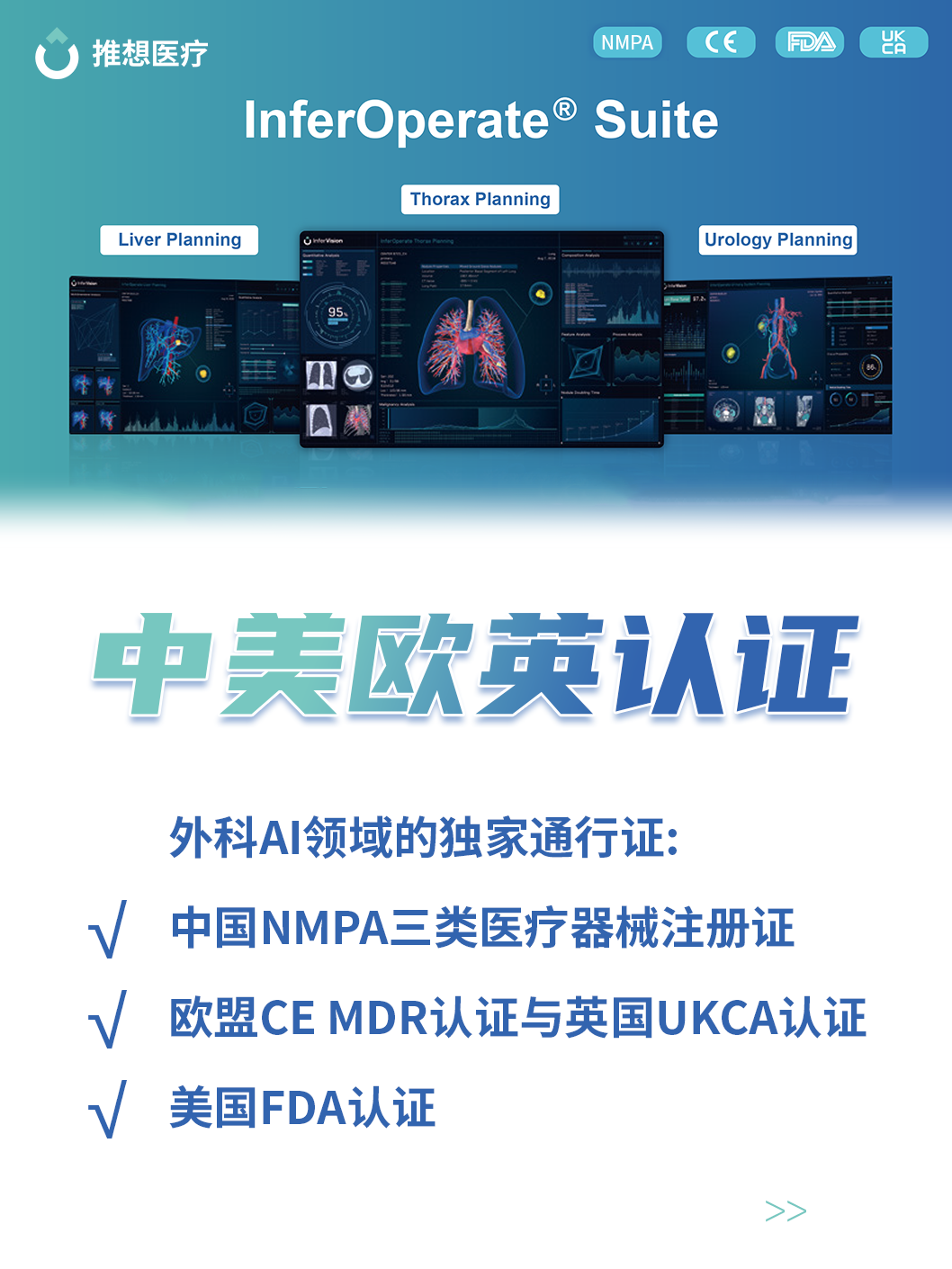 推想医疗在此之前已经取得我国肺部手术规划领域和腹部手术规划领域“第一证”。从中国到欧美,从临床验证到权威认证,推想医疗正引领外科AI从“实验室技术”走向全球临床必备工具。