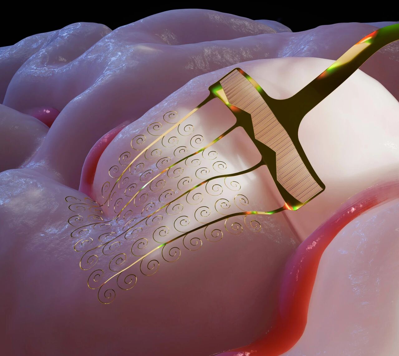 “人类大脑并非静止不动,它会随呼吸与心跳节律性地搏动。在身体运动的过程中,柔软的脑组织会在颅腔内发生位移和形变。”方英告诉记者,面对大脑的动态运动,传统线性电极无法实时地顺应脑组织的变化,因此容易发生电极移位甚至从脑组织中脱出。电极脱出不仅会直接降低大脑神经信号采集的数量与解码精度,还可能引发脑组织炎症反应。“因此,研制能够适应大脑动态运动,实现神经信号长期稳定采集的新型柔性电极技术,是侵入式脑机接口技术临床应用突破的关键。”