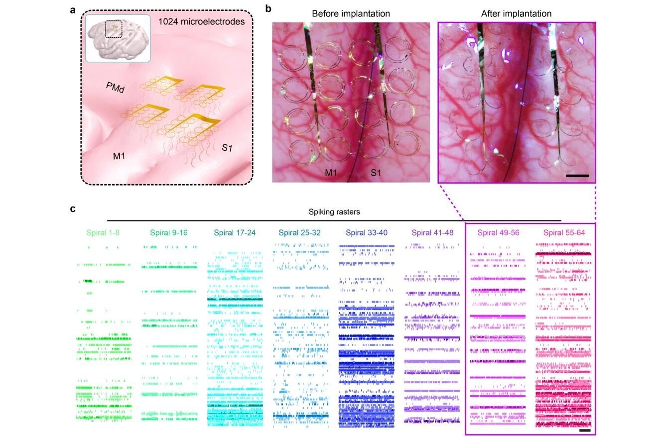 植入1024通道的可拉伸柔性电极后,大脑中的神经元活动记录