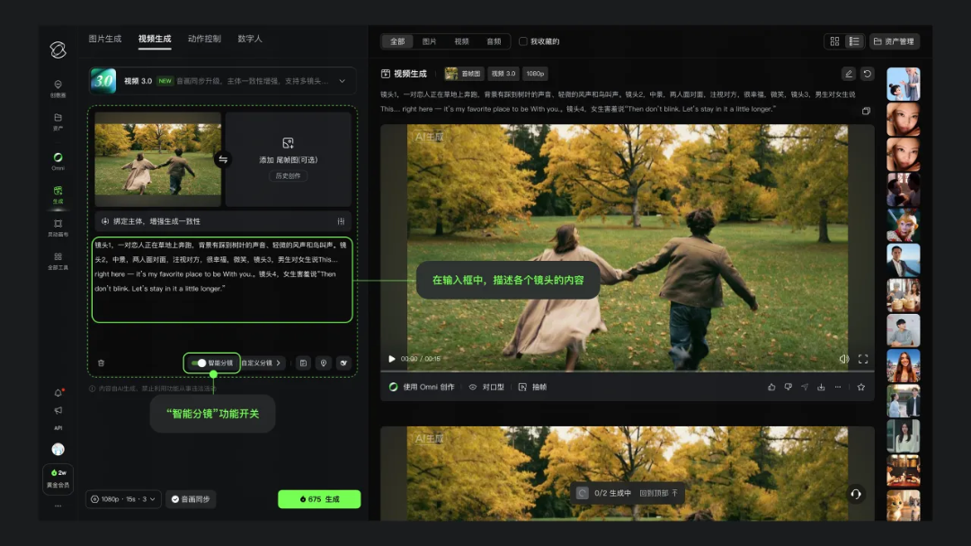在叙事能力方面,新版本实现了显著跃升。它支持最长15秒的连续视频生成,并创新性地引入了智能分镜与自定义镜头控制功能。这意味着,创作者可以通过文字指令,对镜头节奏、景别切换和叙事结构进行更高层级的组织,不再完全依赖于对碎片化片段的后期拼接。同时,模型支持原生音画同步生成,兼容中、英、日、韩、西等多国语言及四川话、粤语等多种地方口音,使角色对话更为自然流畅。