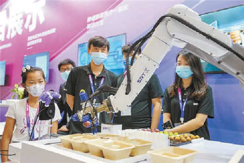 参观者在观看获一等奖的项目之一——软体机器人技术研发和产业孵化项目展示(北京日报记者 武亦彬 摄)