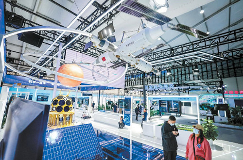 在中关村论坛展览现场,中国空间站、怀柔一号科学卫星、墨子号量子科学实验卫星等模型吸引市民驻足(北京日报记者 武亦彬 摄)