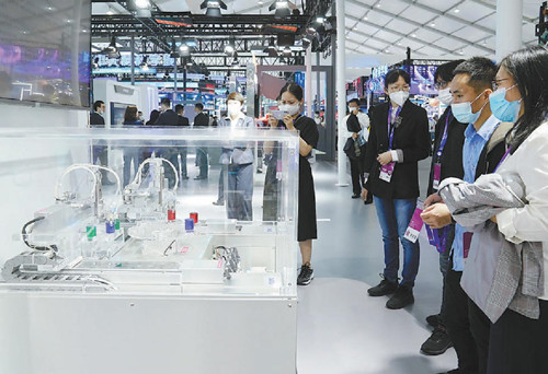 2021中关村论坛展览(科博会)现场,各大科学城纷纷亮出自己的前沿科技成果。图为北京经济技术开发区展台展出电气融合无线阀岛演示装置。