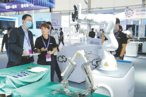 2021中关村论坛展览(科博会)上展出的关节手术机器人引发关注。 (北京日报记者 王海欣 摄)